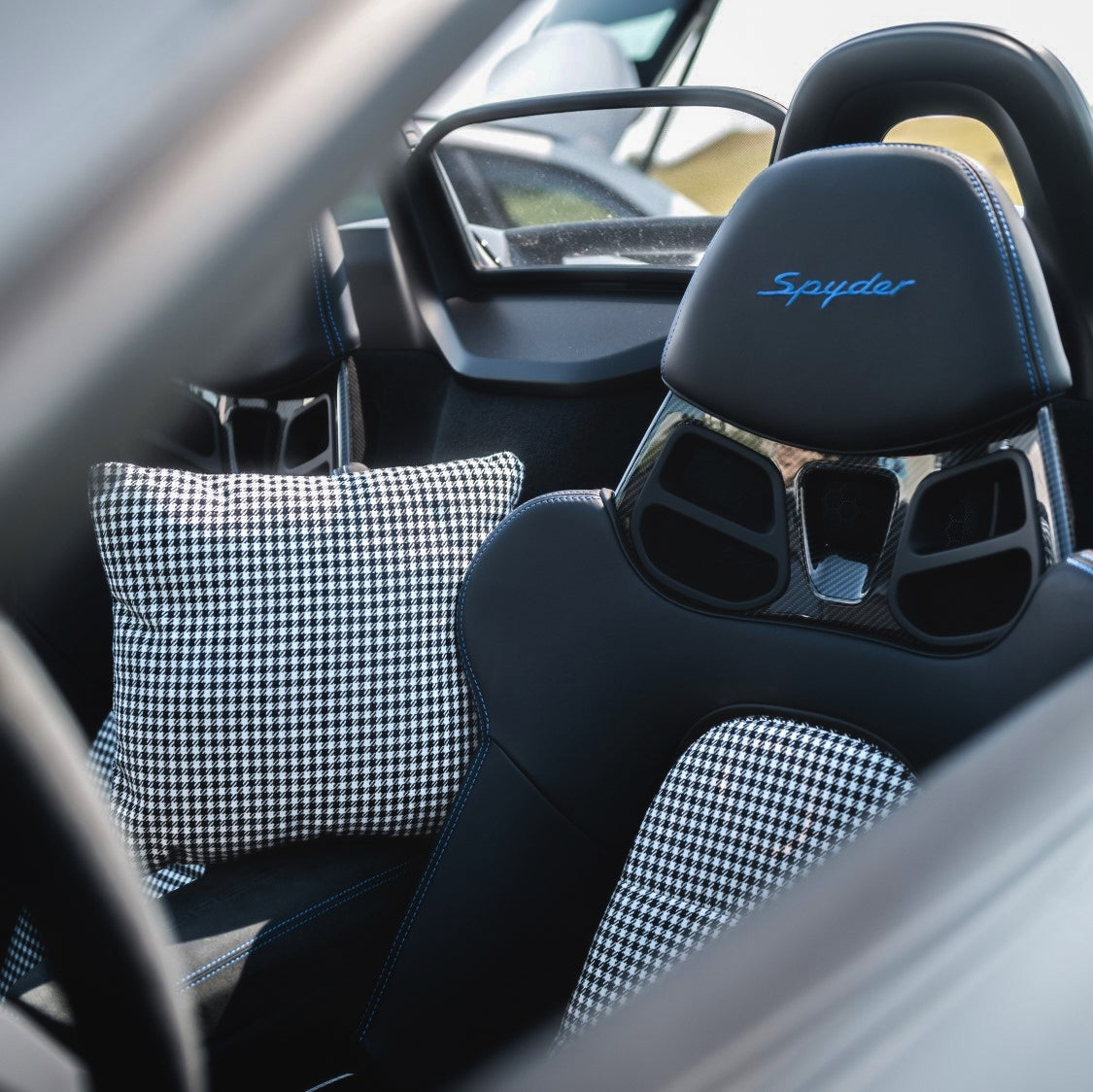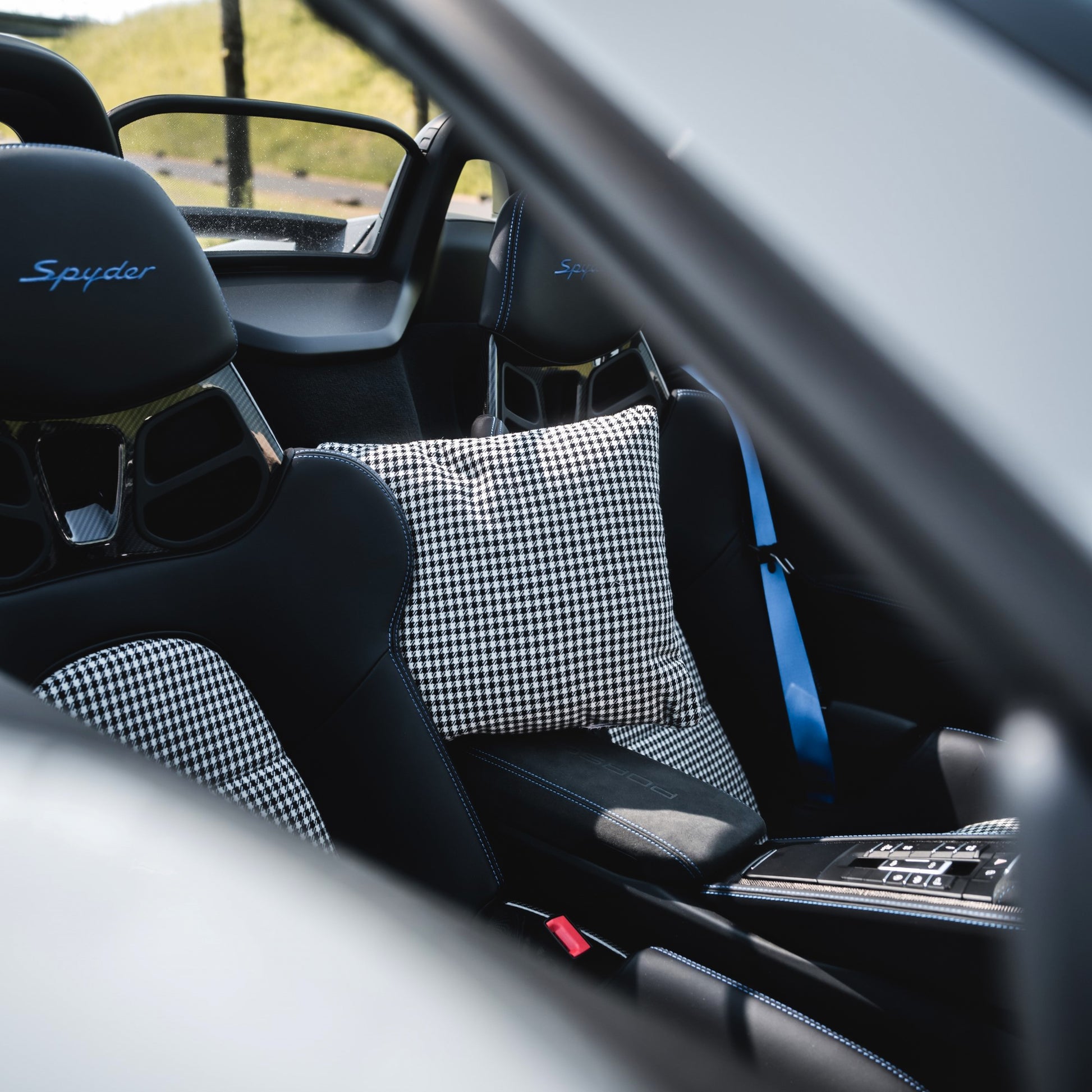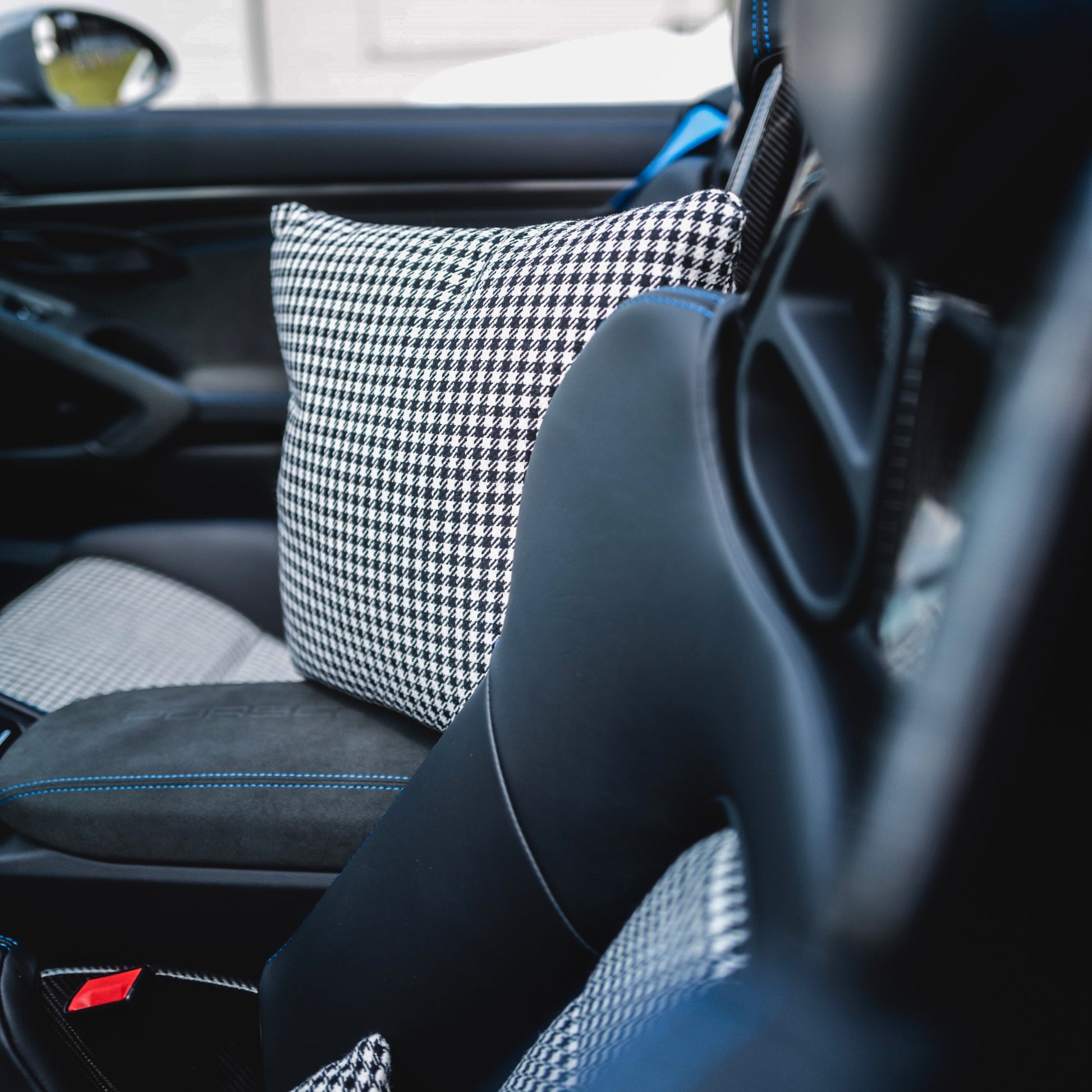 Unser handgefertigtes Kissen in der Größe 40 cm x 40 cm ist mit dem Pepita Classic Stoff bezogen, der auch für die Sitzeinlagen in Porsche-Fahrzeugen verwendet wird.